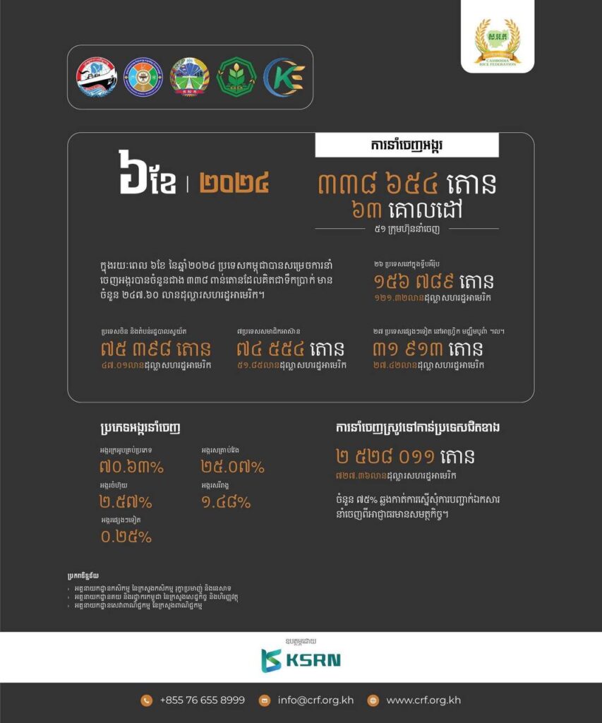 តាមប្រភពដែលដកស្រង់ពីទិន្នន័យរបស់អគ្គនាយកដ្ឋានកសិកម្ម នៃក្រសួងកសិកម្ម រុក្ខាប្រមាញ់ និងនេសាទ, អគ្គនាយកដ្ឋានគយ និងរដ្ឋាករ នៃក្រសួងសេដ្ឋកិច្ច និងហិរញ្ញវត្ថុ និងអគ្គនាយកដ្ឋានសេវាពាណិជ្ជកម្មនៃក្រសួងពាណិជ្ជកម្ម បញ្ជាក់ថា ក្នុងរយៈពេល ៦ខែ ដើមឆ្នាំ២០២៤នេះ កម្ពុជាមានការនាំចេញអង្ករសរុបចំនួន ៣៣៨,៦៥៤តោន គិតជាទឹកប្រាក់ ២៤៧,៦០លានដុល្លារអាមេរិក តាមរយៈក្រុមហ៊ុននាំចេញអង្ករចំនួន ៥១ និងនាំទៅកាន់គោលដៅចំនួន ៦៣។ ទិន្នន័យនៃការនាំចេញអង្ករលម្អិតរួមមាន៖ ការនាំចេញអង្ករទៅកាន់ ២៦ប្រទេសក្នុងទ្វីបអឺរ៉ុបមានចំនួន ១៥៦,៧៨៩តោន គិតជាទឹកប្រាក់ ១២១.៣២លានដុល្លារអាមេរិក, នាំចេញទៅកាន់ប្រទេសចិន និងតំបន់រដ្ឋបាលស្វយ័តចំនួន ៧៥,៣៩៨តោន គិតជាទឹកប្រាក់ ៤៧.០១លានដុល្លារអាមេរិក, នាំចេញទៅកាន់ ៧ប្រទេសជាសមាជិកអាស៊ានចំនួន ៧៤,៥៥៤តោន គិតជាទឹកប្រាក់ ៥១.៨៥លានដុល្លារអាមេរិក និងនាំចេញទៅកាន់២៧ប្រទេសផ្សេងៗ នៅអាហ្វ្រិក និងមជ្ឈិមបូព៌ាចំនួន ៣១,៩១៣តោន គិតជាទឹកប្រាក់ ២៧.៤២លានដុល្លារអាមេរិក។